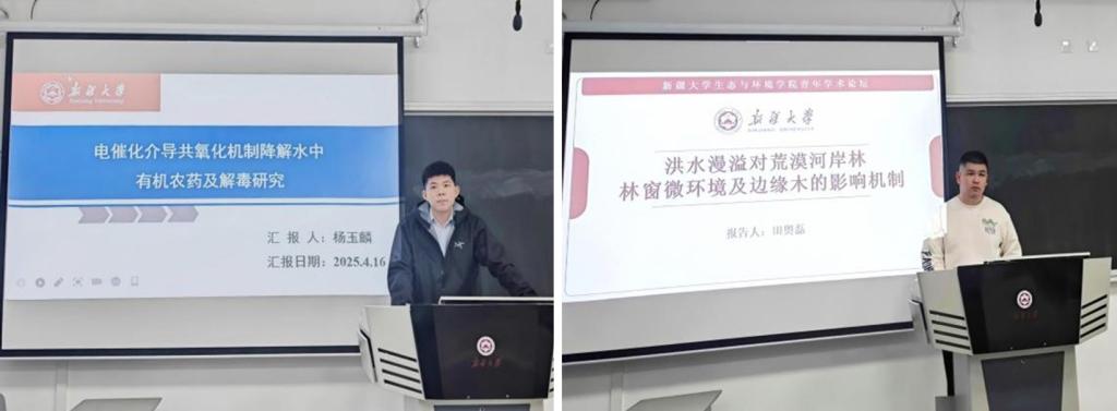 田奥磊博士生的报告题目为“洪水漫溢对荒漠河岸林林窗微环境及边缘木的影响机制”。塔里木河流域荒漠河岸林作为三北防护林的重要组成部分,其自然更新和健康发展至关重要。他所在的课题组针对塔里木河中游英巴扎断面洪水漫溢与非漫溢区林窗和植物生理指标进行测量和分析,通过非靶向代谢组学技术,鉴定植物样本中的代谢物,分析洪水漫溢和林窗形成对植物代谢物表达量的影响。该研究可为干旱区荒漠河岸林在全球变化背景下的保护和管理提供科学依据。
