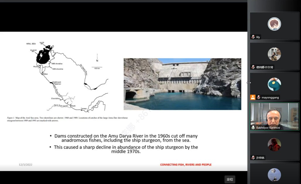 会议于北京时间12:00正式开始,首先,Bakhtiyor K.Karimov教授以koksu河为例,阐述中亚山区河流水电项目对鱼类保护的环境影响,之后,Shamshodbek Akmalov教授介绍了不同生态因子对咸海下游流域水资源管理的影响。