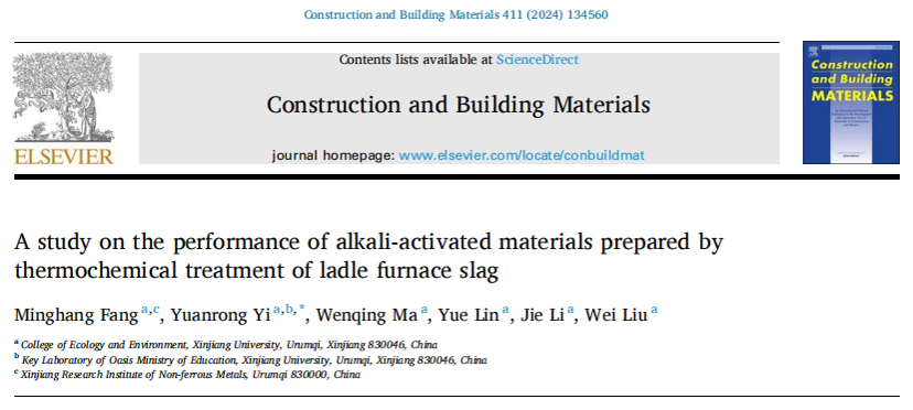 2023年12月21日,公司伊元荣教授课题组在工程技术1区期刊Construction and Building Materials上发表题为“A study on the performance of alkali-activated materials prepared by thermochemical treatment of ladle furnace slag”的研究论文,分析了热活化制备的碱激发胶凝材料的性能,论文第一作者为硕士研究生方明航。