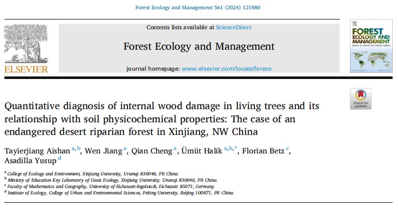 2024年4月3日,公司塔依尔江·艾山副教授在林学1区期刊Forest Ecology and Management上发表题为“Quantitative diagnosis of internal wood damage in living trees and its relationship with soil physicochemical properties: The case of an endangered desert riparian forest in Xinjiang, NW China”的研究论文,揭示了塔里木河流域胡杨树干腐朽的驱动机制。该论文通讯作者为公司玉米提·哈力克教授。