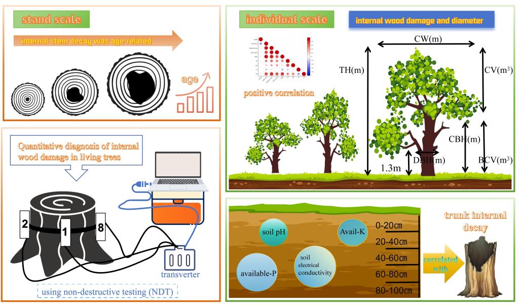 树干内部的损伤对林木健康构成严重威胁。因此,定量诊断树干内部健康状况显得尤为重要。揭示胡杨树干腐朽的驱动机制,可为胡杨活立木腐朽的防治和干旱区天然河岸林资源保育与可持续管理提供科学支撑。
