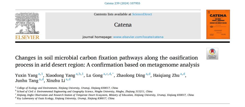 2024年3月5日,公司贡璐教授课题组在农林科学1区期刊Catena上发表题为“Changes in soil microbial carbon fixation pathways along the oasification process in arid desert region: A confirmation based on metagenome analysis”的研究论文,提出了干旱荒漠地区土壤碳固定过程中的微生物碳固定新见解,论文第一作者为硕士研究生杨钰鑫。
