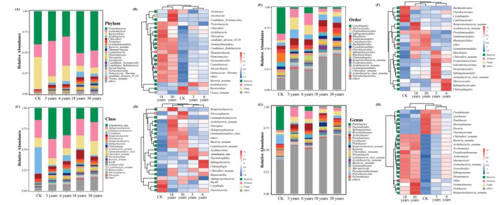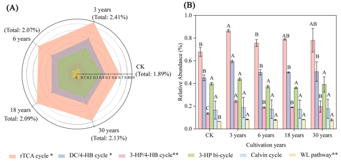 该研究采用宏基因组测序技术测定了西北干旱荒漠区4个不同耕作年限(即3年、6年、18年和30年)的天然荒漠灌丛(CK)土壤微生物群落结构、固碳相关基因和固碳途径的变化及其与土壤性质的关系。研究发现细菌是土壤优势类群,其相对丰度随栽培年限逐渐降低。变形菌门(Proteobacteria)、放线菌门(Actinobacteria)、拟杆菌门(Bacteroides)和酸杆菌门(Acidobacteria)是荒漠灌丛和绿洲农田土壤微生物的优势门,它们的相对丰度随着栽培年限的变化而发生明显变化。人类的农业活动改变了土壤环境,从而影响了微生物的碳固定。在养分贫乏的土壤中,受能量供应的限制,rTCA 和 DC/4-HB 循环主要被绿洲农田中的微生物用来固定碳。