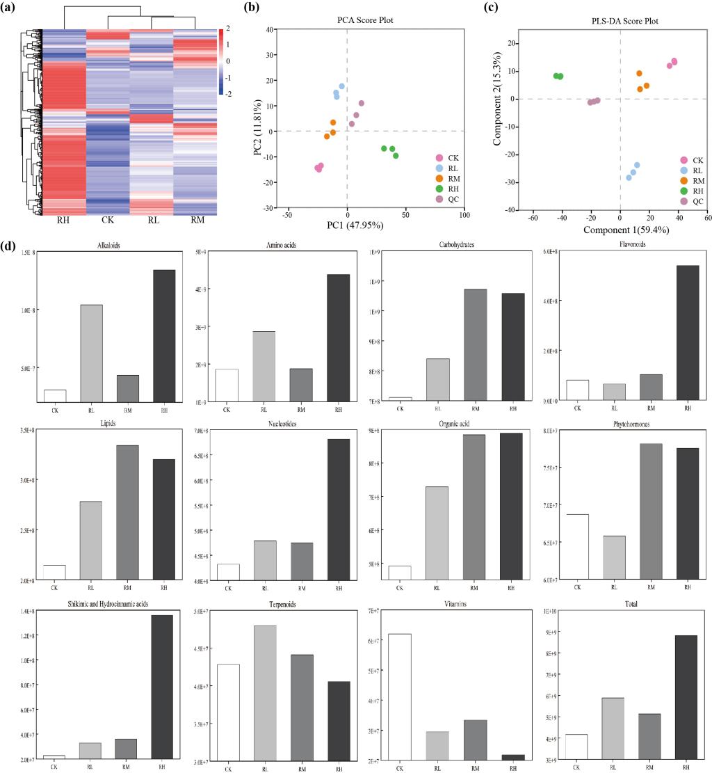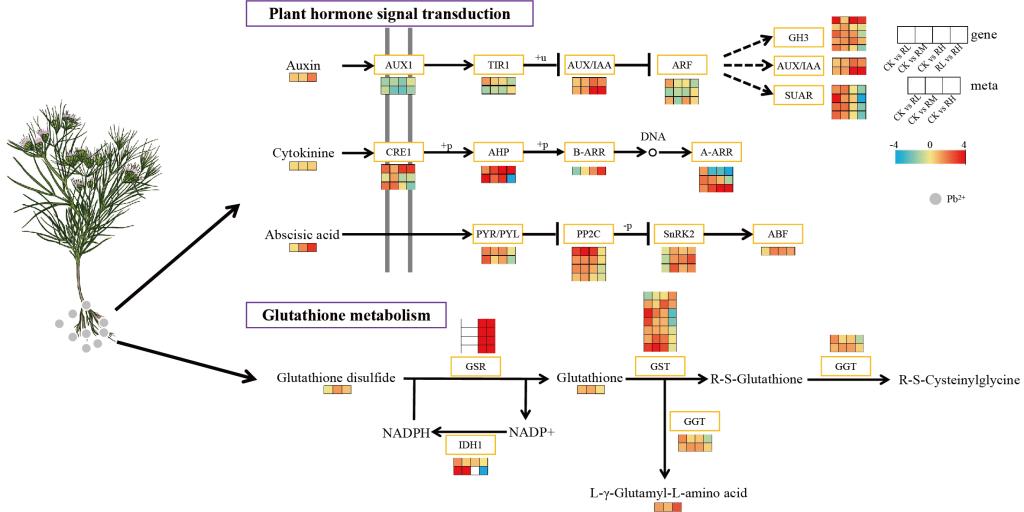 该研究结合生理学、转录组学和代谢组学探究孜然响应铅胁迫的分子机制。结果表明,铅胁迫改变孜然的生理生化指标,抑制了孜然的生长。同时,孜然通过改变根部金属离子转运基因的表达,影响铅的积累和转运。代谢组学分析表明,在铅胁迫下,与氨基酸、有机酸和碳水化合物相关的代谢途径得到了增强。转录组测序筛选出的差异表达基因(DEGs)主要涉及氧化还原酶活性、跨膜运输、植物激素信号转导和MAPK信号转导途径。综合分析表明,谷胱甘肽代谢和植物激素信号转导是孜然抵抗铅胁迫的重要途径。