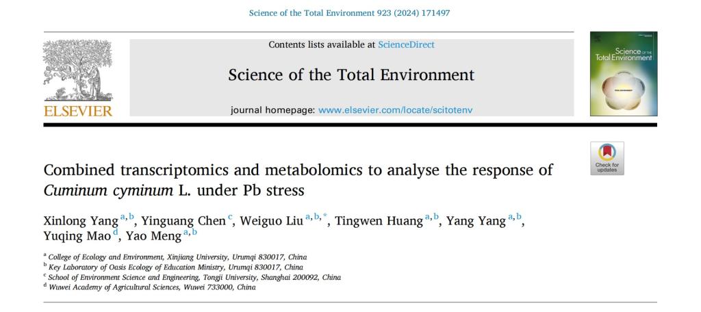 2024年3月6日,公司刘卫国教授课题组在环境科学与生态学1区期刊Science of The Total Environment上发表题为“Combined transcriptomics and metabolomics to analyse the response of Cuminum cyminum L. under Pb stress”的研究论文,分析了孜然抵抗铅胁迫的分子机制,论文第一作者为硕士研究生杨新龙。