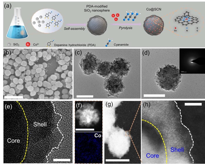 图1  形貌和结构表征。a Co@SCN的合成示意图;b Co@SCNSEM图;c,d Co@SCNHRTEM图,插图:图(d)对应的环状SAED图;e Co@SCN核壳结构的放大HRTEM图;f Co@SCNCo元素的EDS图谱;g,h Co@SCNHAADF-STEM图。标尺:b 100 nmcdfg 50 nmeh 2 nm