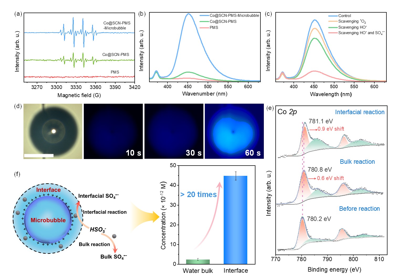图2 在空气-水界面催化产生ROSa微气泡存在/不存在时Co@SCN-PMS中生成的ROSEPR光谱;b微气泡对Co@SCN-PMS系统中7-羟基香豆素生成的影响;c不同清除剂对Co@SCN-PMS-微气泡系统中7-羟基香豆素生成的影响;d Co@SCN-PMS-微气泡系统中不同反应时间内微气泡的明视野和荧光图像;e Co@SCN在界面/体反应前后的Co 2p XPS光谱;f SO4•−在界面和体溶液中催化生成的示意图及其各自的浓度(误差条代表2次独立测量的标准偏差)。条件:[Co@SCN]=0.01 g L−1[PMS]=0.1 g L−1[DMPO]=100 μM[香豆素]b=1.0 mMd=20 μM[EtOH]=[TBA]=[TEMP]=10 mMpH=5.6d的标尺:300 μm