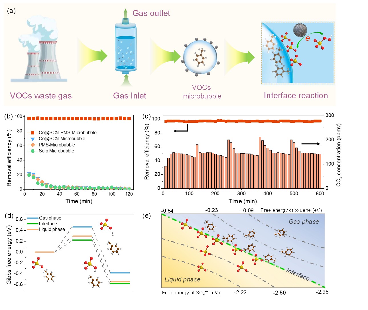 图3 界面SO4•−的氧化性能。a用于净化VOCs废气的Co@SCN-PMS-微气泡系统示意图;b不同微气泡条件下甲苯氧化的对照实验;c Co@SCN-PMS-微气泡系统中通过多次添加PMS实现甲苯氧化的长期性能;d SO4•−氧化甲苯至两个关键反应中间产物的势能图计算,以及气相、界面和液相中相应反应的吉布斯自由能比较;e SO4•−和甲苯在气液相转变过程中的自由能变化比较。bc的条件:每次反应120 min[Co@SCN]=0.2 g L−1[PMS]=2.0 g L−1pH=3.0[甲苯]inlet=30 ppmv