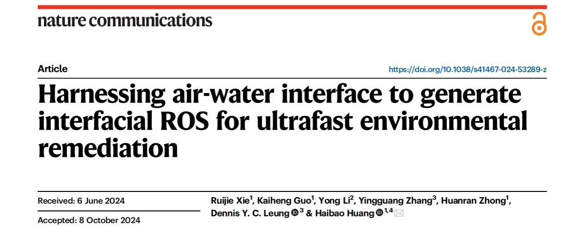 20241014日,公司黄海保教授课题组在综合性1区期刊Nature Communications上在线发表了题为“Harnessing air-water interface to generate interfacial ROS for ultrafast environmental remediation”的研究论文,开发了一种利用气-水界面加速ROS诱导反应的策略。