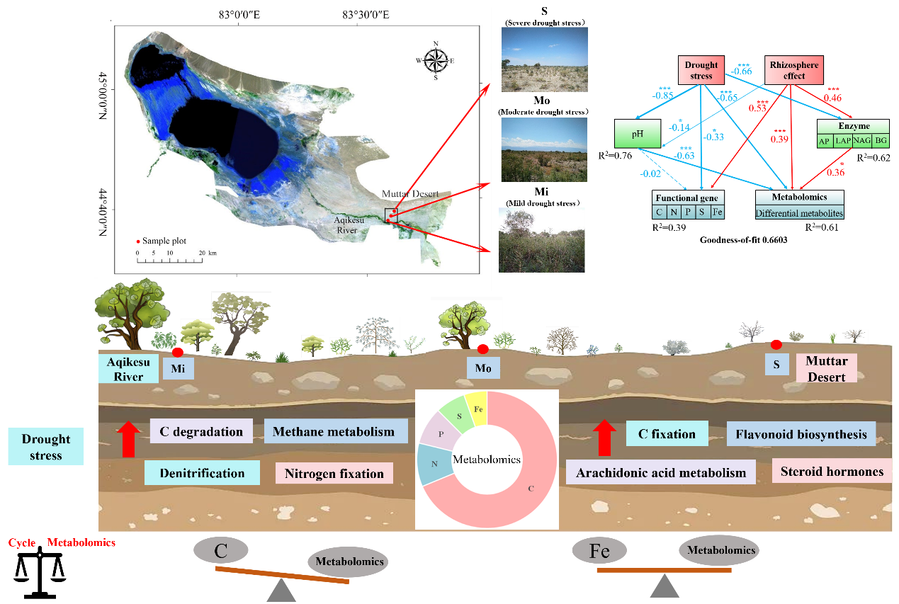 该研究利用宏基因组学和代谢组学技术,探讨荒漠河岸林微生物功能循环和差异代谢途径。结果表明,研究区生物地球化学循环以碳、氮循环为主,占碳、氮、磷、硫、铁循环的78.90%。干旱导致土壤固碳增加,碳降解和甲烷代谢减少,反硝化作用减弱,固氮作用降低。干旱会破坏铁的体内平衡,减少铁的吸收。干旱胁迫的差异代谢途径包括类黄酮生物合成、花生四烯酸代谢、类固醇激素生物合成以及淀粉和蔗糖的降解。功能基因的网络分析碳循环与代谢网络存在明显的竞争关系,而铁循环与代谢网络相互促进,优化资源利用。干旱阻碍了代谢过程和功能基因的表达,而根际环境促进了代谢表达和功能基因的表达。根际效应主要通过土壤酶活性间接促进代谢过程。综合多组学分析进一步表明,干旱和根际对土壤功能循环的形成和代谢物的积累起主导作用。
