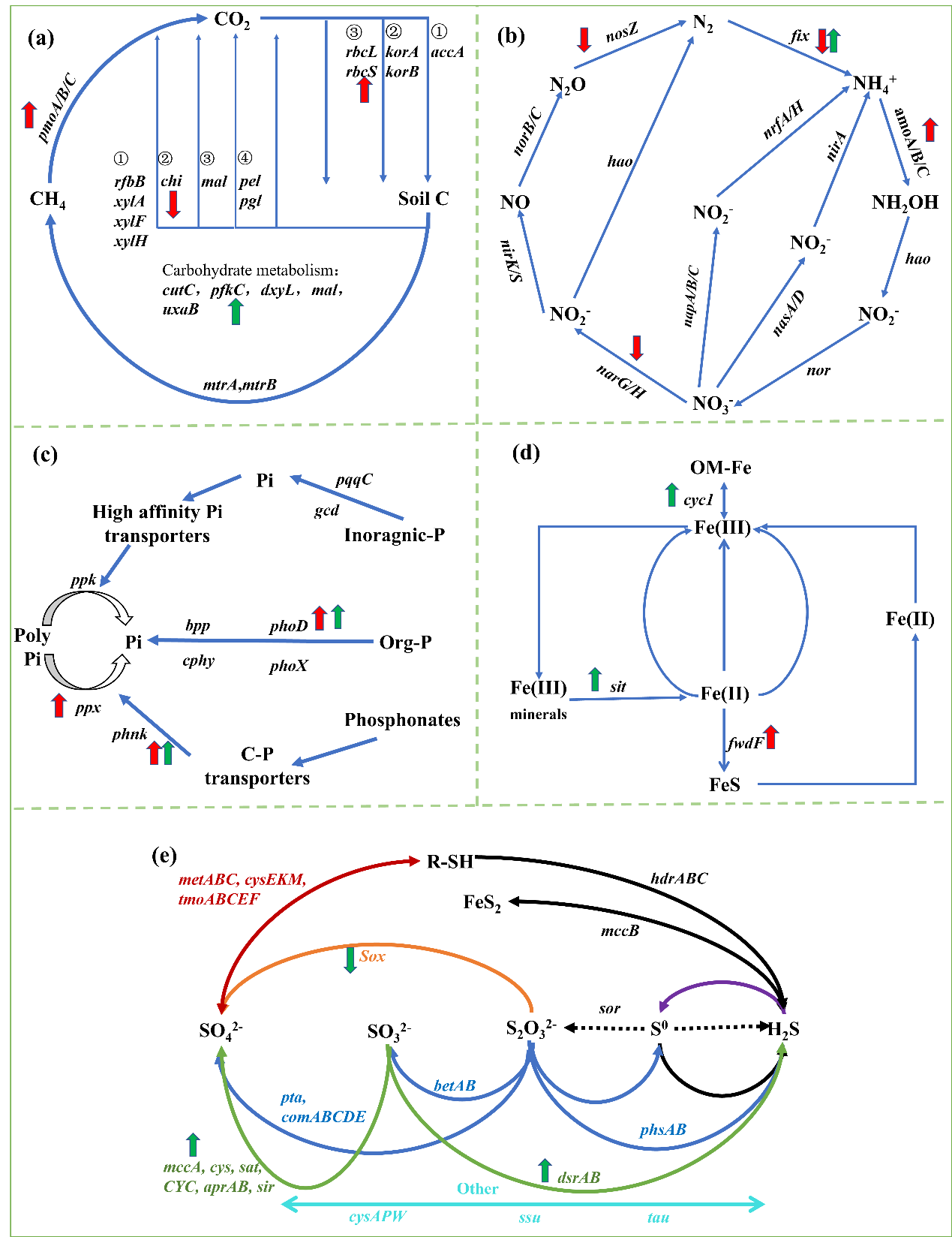 图1 C、N、P、S 和 Fe 循环中功能基因示意图