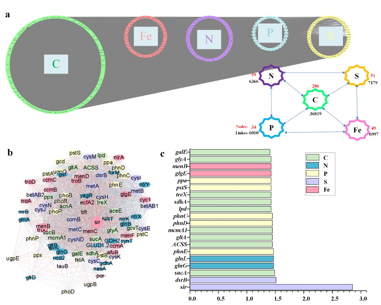 图3 (a) 生物地球化学循环网络图; (b) 生物地球化学循环网络分析; (c) 网络度中心性(前20)贡献率