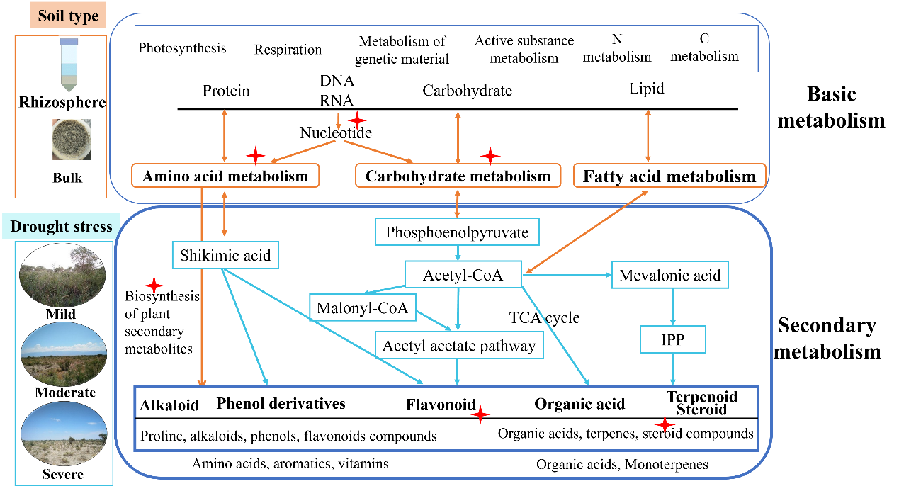 图2 根际示意图及干旱对初级和次级代谢产物的影响