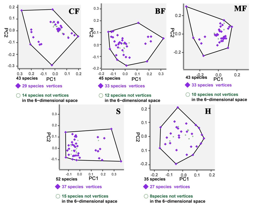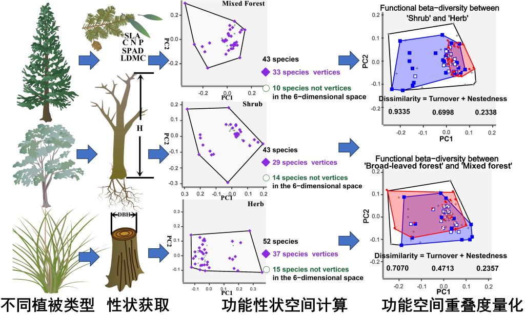 功能性状随植被类型而变化,但尚不清楚由功能性状组成的多维功能空间如何适应天然森林植物群落,尤其是在土壤微环境尺度上。土壤因素对森林生态系统功能多样性的影响亟待研究。