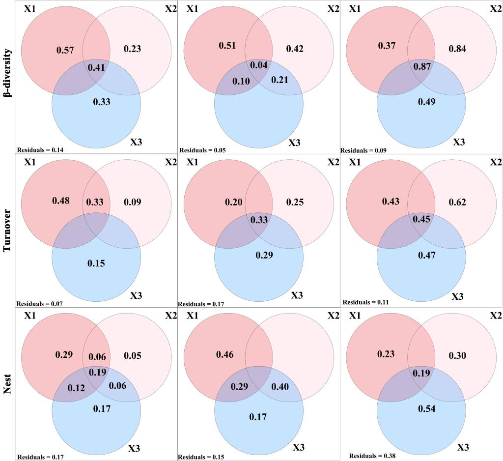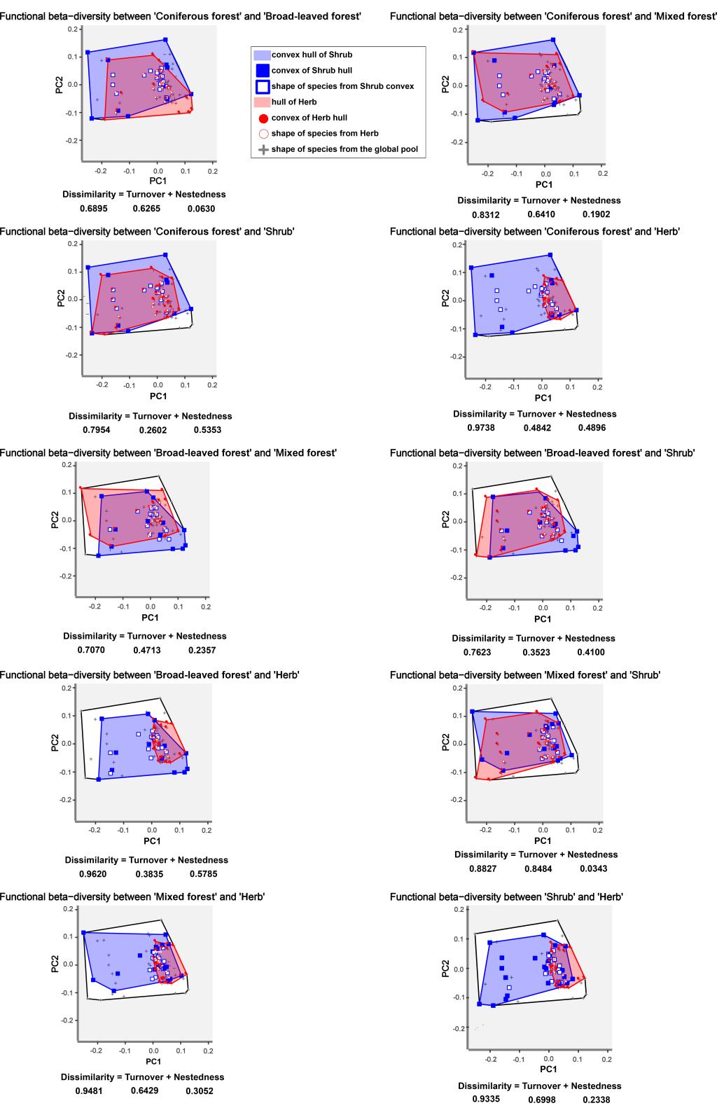 研究发现随着经度增加,土壤营养和水热条件变得相对贫瘠。不同植被类型功能空间其丰富度(FRic)和均匀度(FEve)展现趋势为混交林>阔叶林>针叶林>灌木林>草地,而功能分异度(FDiv)则没有显著变化。功能空间的大小随着土壤养分和水分含量的增加而扩大,而功能均匀度和差异性与坡度和土壤温度显著相关。总功能β多样性与βnest组分有相似的趋势,在森林-草本植物组合(0.30520.5787)中达到最大值,这表明森林和草地中的植物具有不同的生态功能,采取不同的生长策略。混交林-灌木林组合的βnest成分最小(0.0343),而βturn成分最大(0.8484)。影响植被功能多样性的最重要因素是土壤养分含量、土壤水分含量和土壤温度。